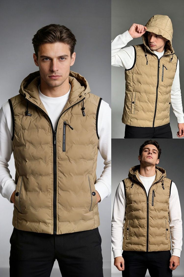 - Αθλητικό ανδρικό γιλέκο σε μπεζ χρώμα με σταθερή κουκούλα με κορδόνια, κατάλληλο για καθημερινή χρήση.
