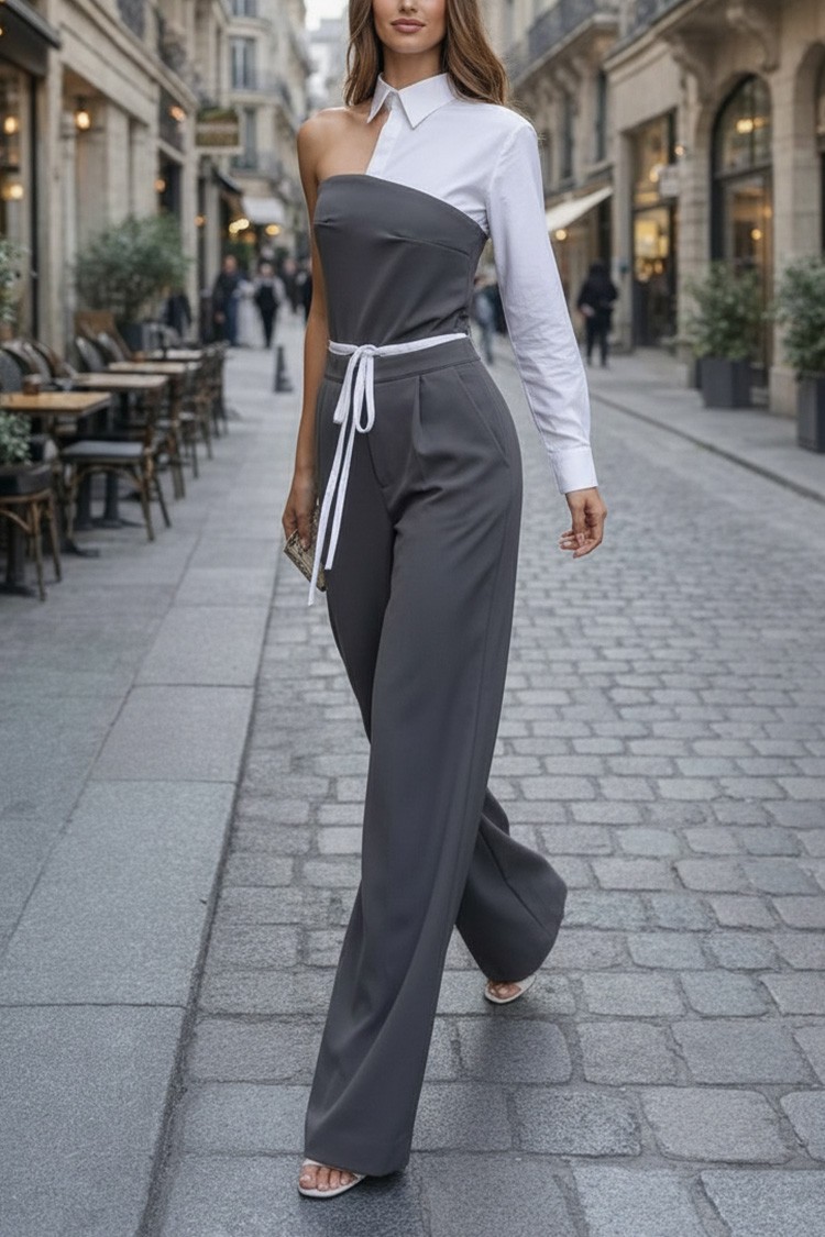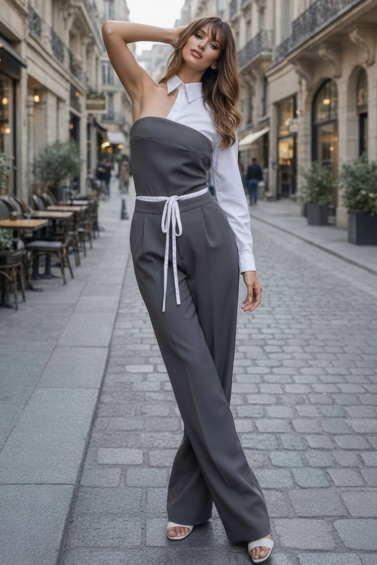 - Το πάνω μέρος είναι ένα σέξι τοπ με ασύμμετρη γραμμή, γιακά και συνδυασμό υφασμάτων.