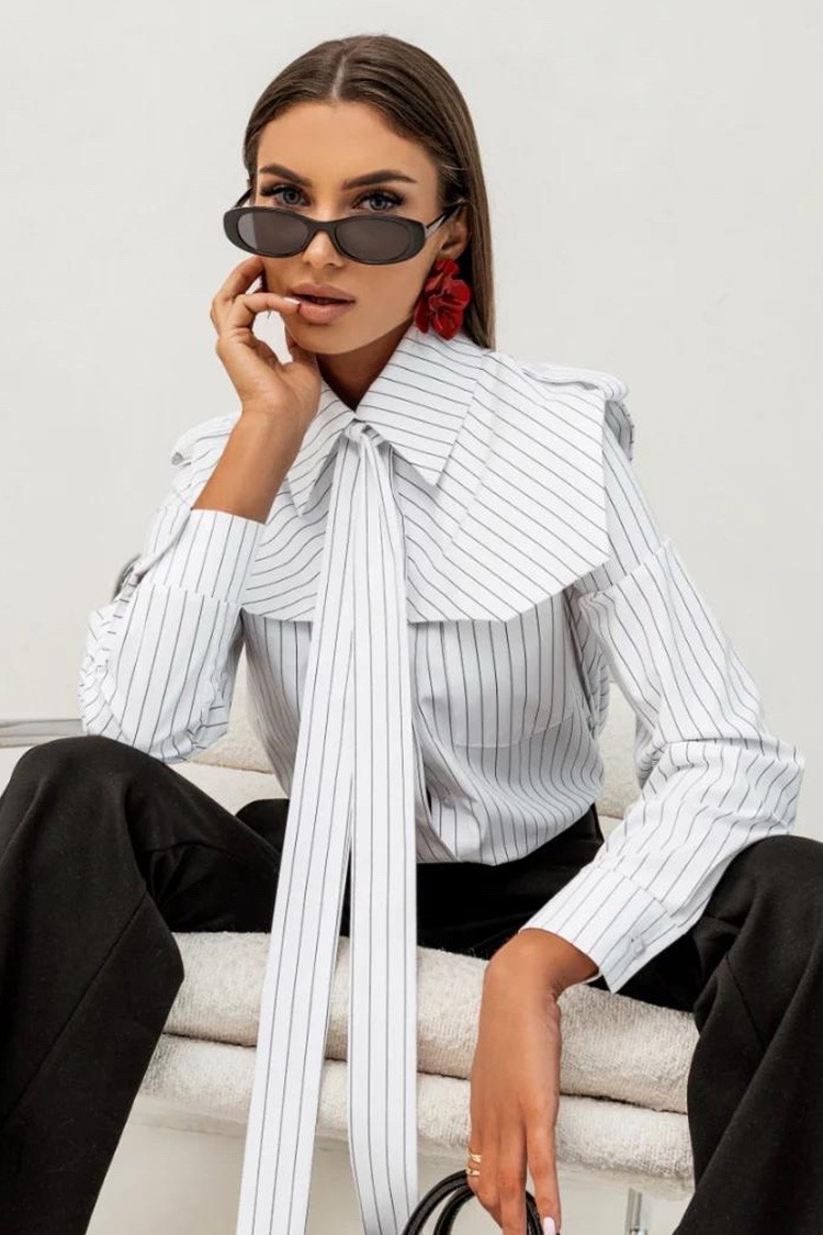 - Το μοντέλο έχει μακριά μανίκια, εντυπωσιακό ριγέ σχέδιο και γραβάτα.