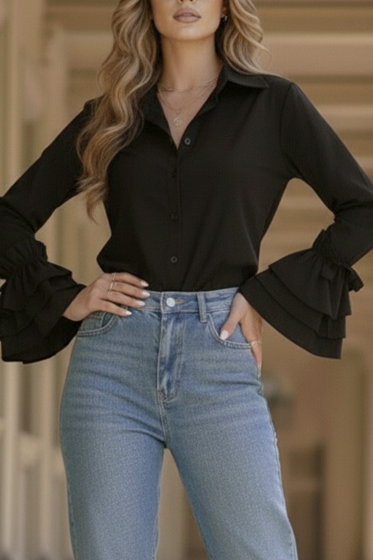 - Το μοντέλο έχει κοκέτο σχεδιασμό, κουμπιά σε όλο το μήκος και μακριά μανίκια με εντυπωσιακά βολάν.