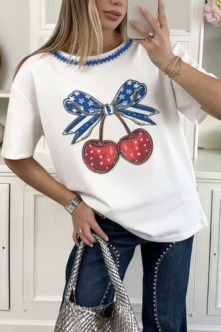 - Το μοντέλο έχει κοντά μανίκια, στρόγγυλη λαιμόκοψη, κλασικό σχεδιασμό και εντυπωσιακό print με κεράσια.