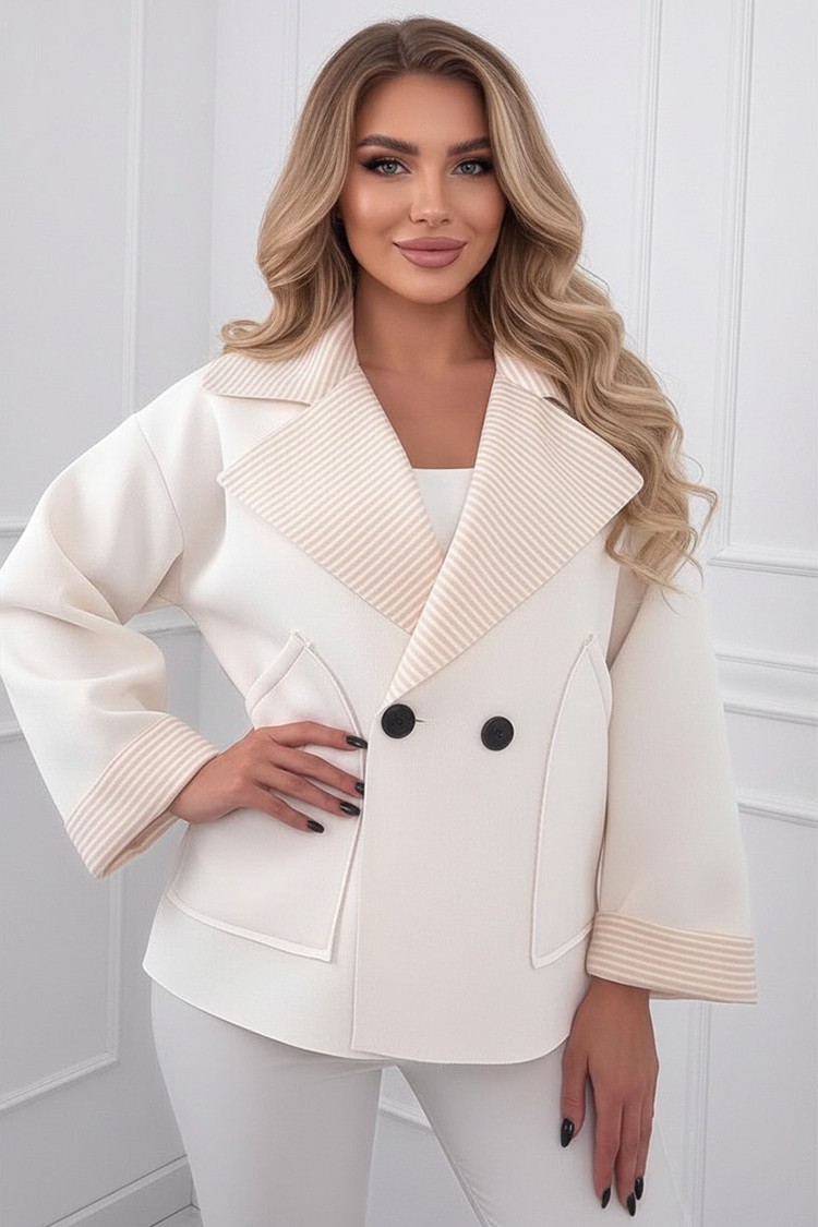 - Το μοντέλο έχει κοντό μήκος, πλαϊνές τσέπες και κουμπιά μπροστά.