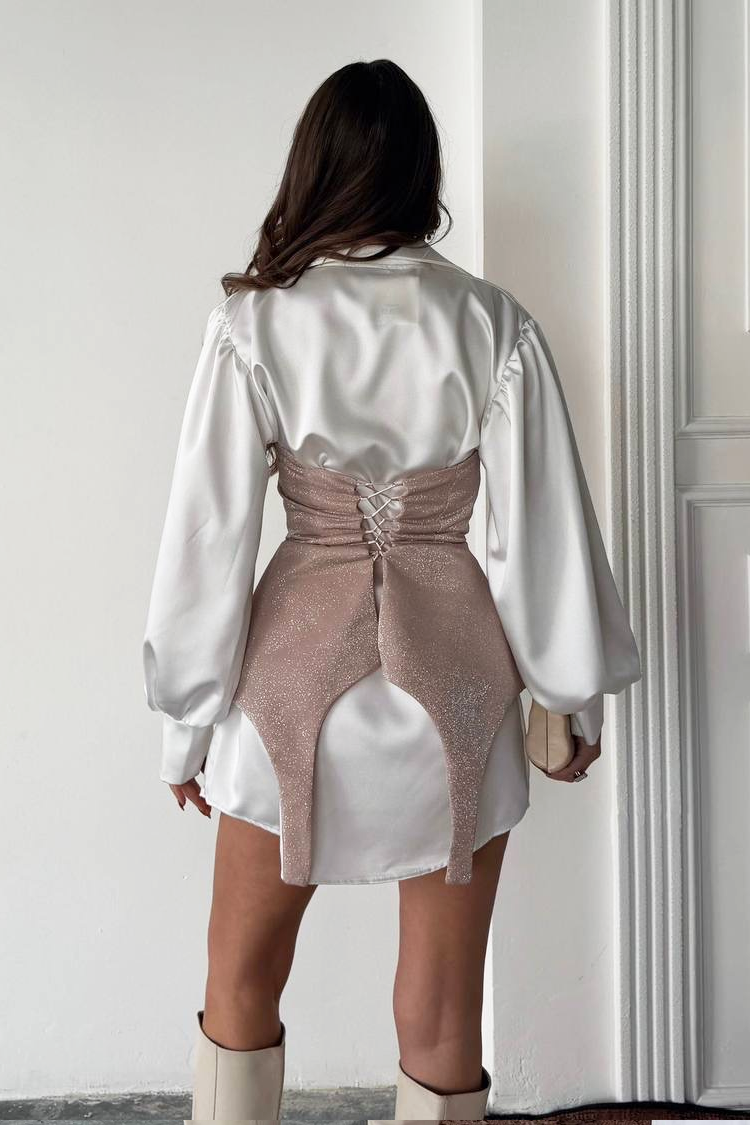 - Το μοντέλο έχει μακριά μανίκια, κομψή γραμμή και κορσέ με λαμπερό εφέ και κορδόνια πίσω.