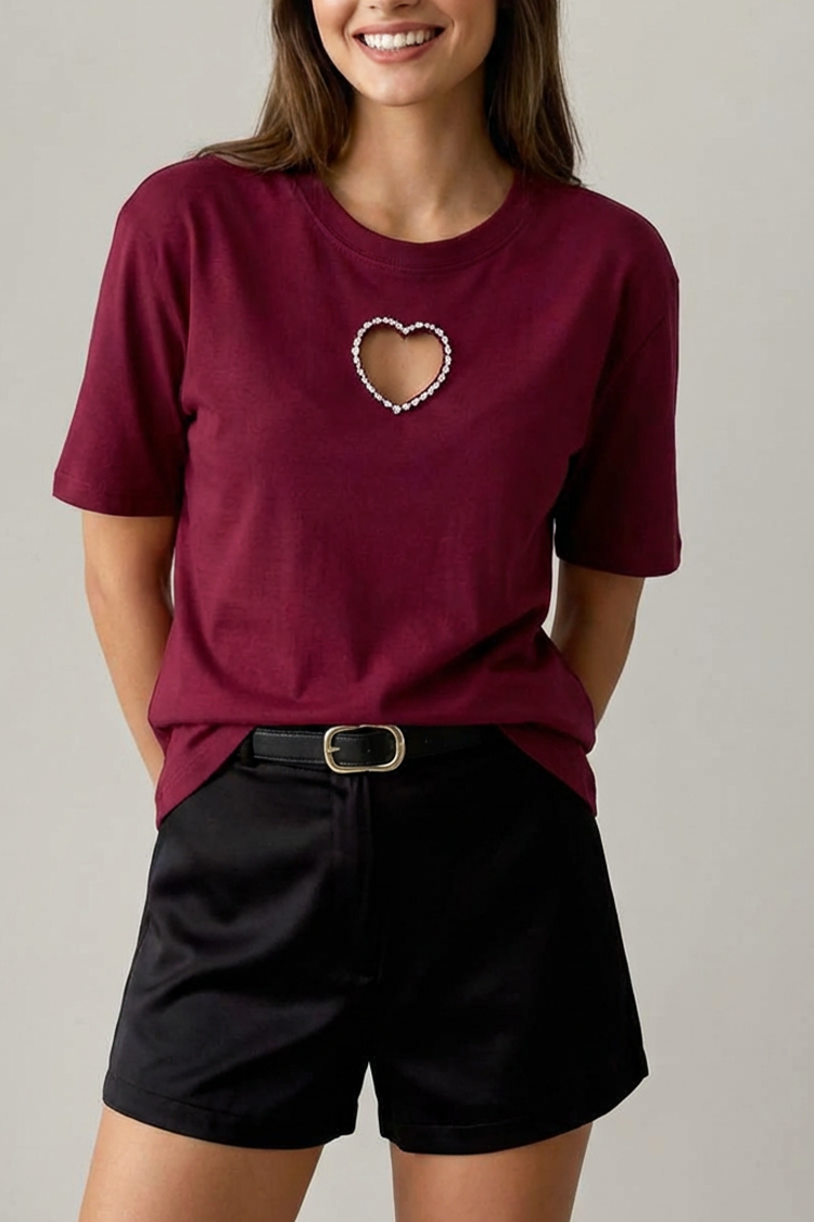 - Το μοντέλο έχει κοντά μανίκια, στρόγγυλη λαιμόκοψη, διακοσμητικό στοιχείο σε σχήμα καρδιάς με διακοσμητικές πέτρες.