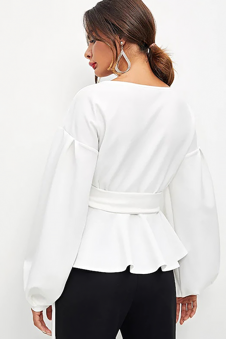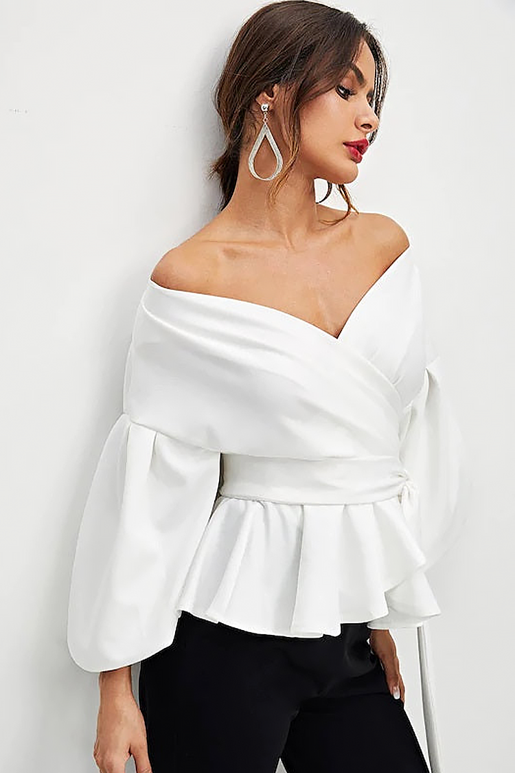 - Το μοντέλο έχει μακριά μανίκια, κοκέτο σχεδιασμό, εντυπωσιακή ζώνη και ανοιχτούς ώμους.