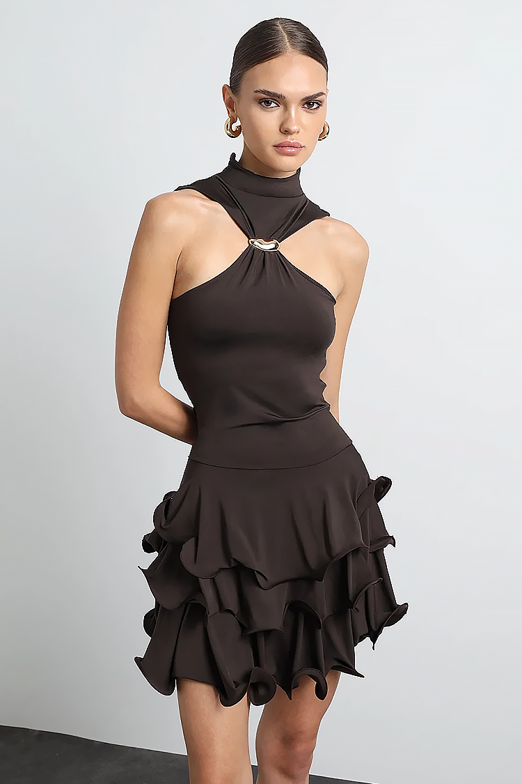 - Το μοντέλο είναι κοντό, με σέξι σχεδιασμό, βολάν και ασύμμετρο πάνω μέρος με μεταλλική λεπτομέρεια.