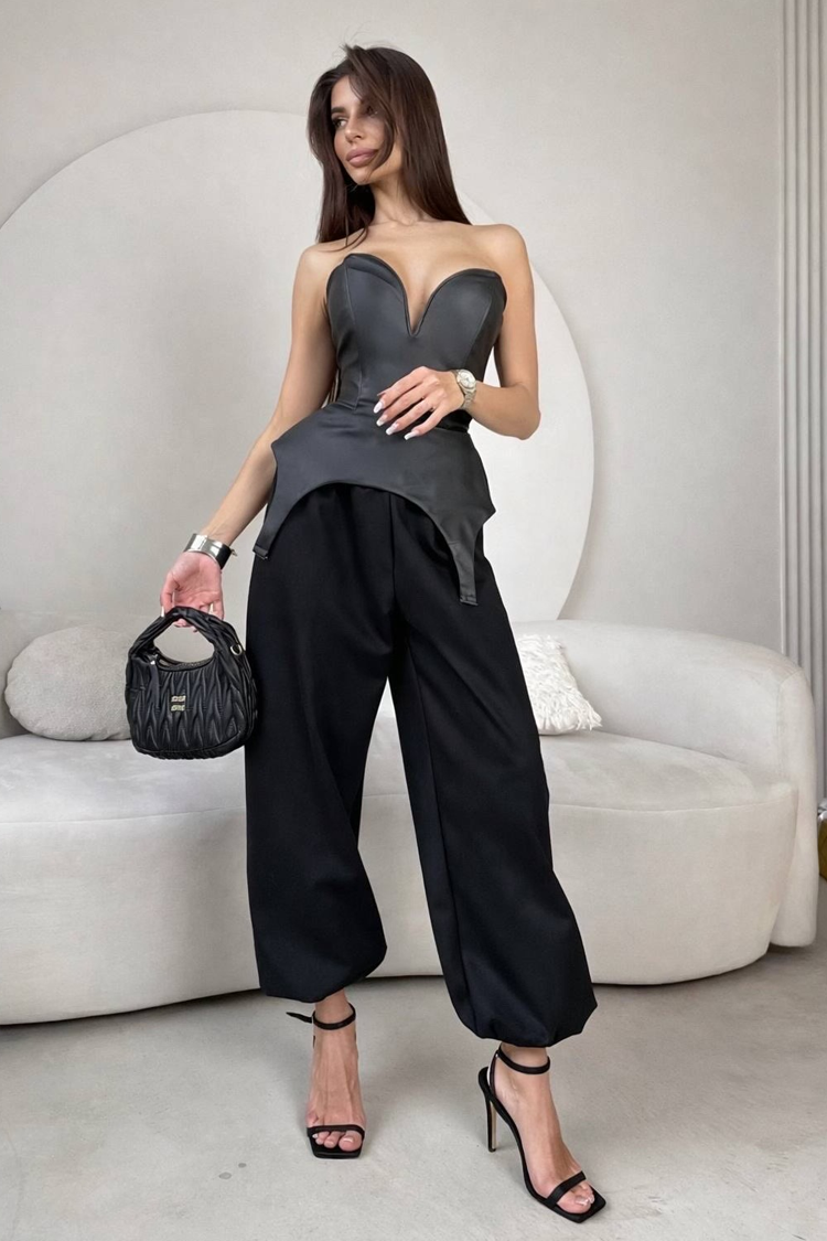 - Καθημερινό σύνολο από δύο κομμάτια, που αποτελείται από τοπ και παντελόνι σε κλασικό χρώμα.