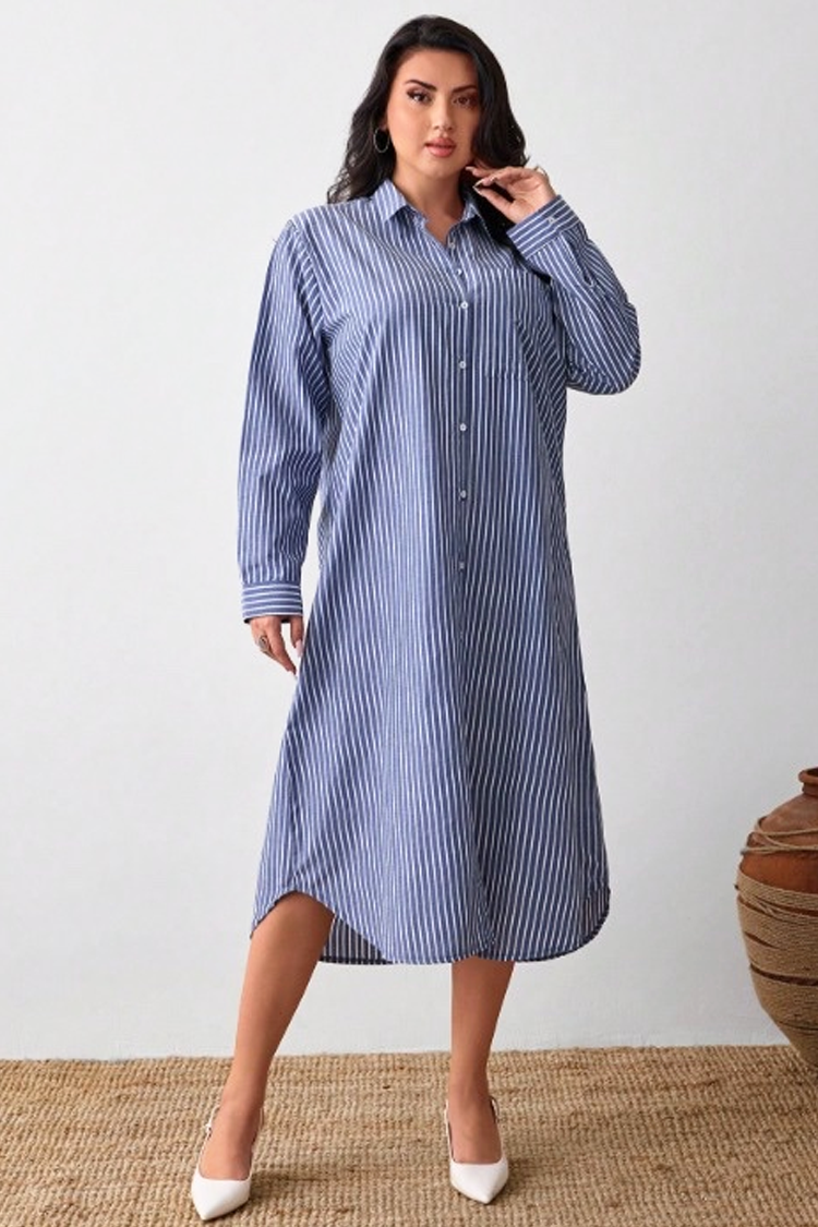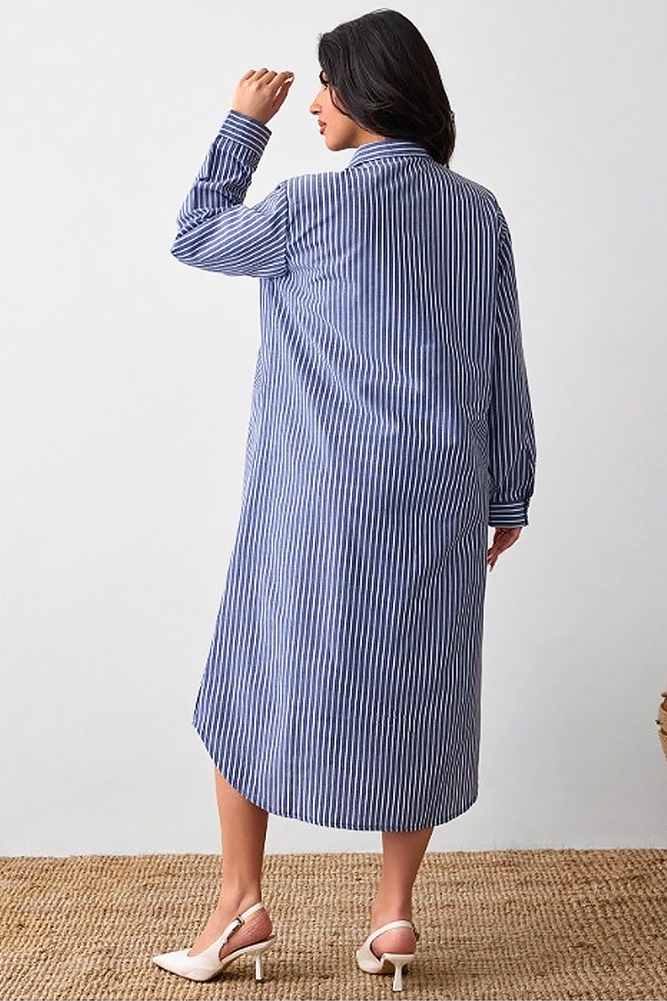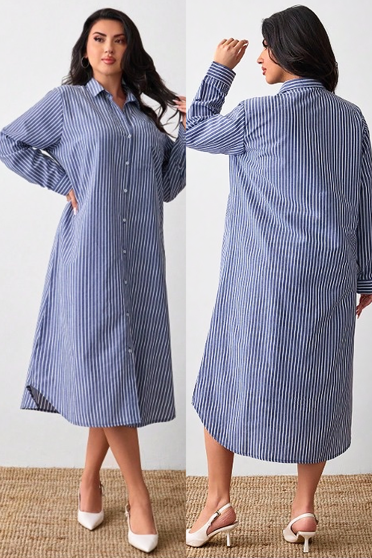 - Midi φόρεμα τύπου πουκάμισου με εντυπωσιακό μοτίβο ριγέ και λιτό σχεδιασμό, κατάλληλο για καθημερινή χρήση.