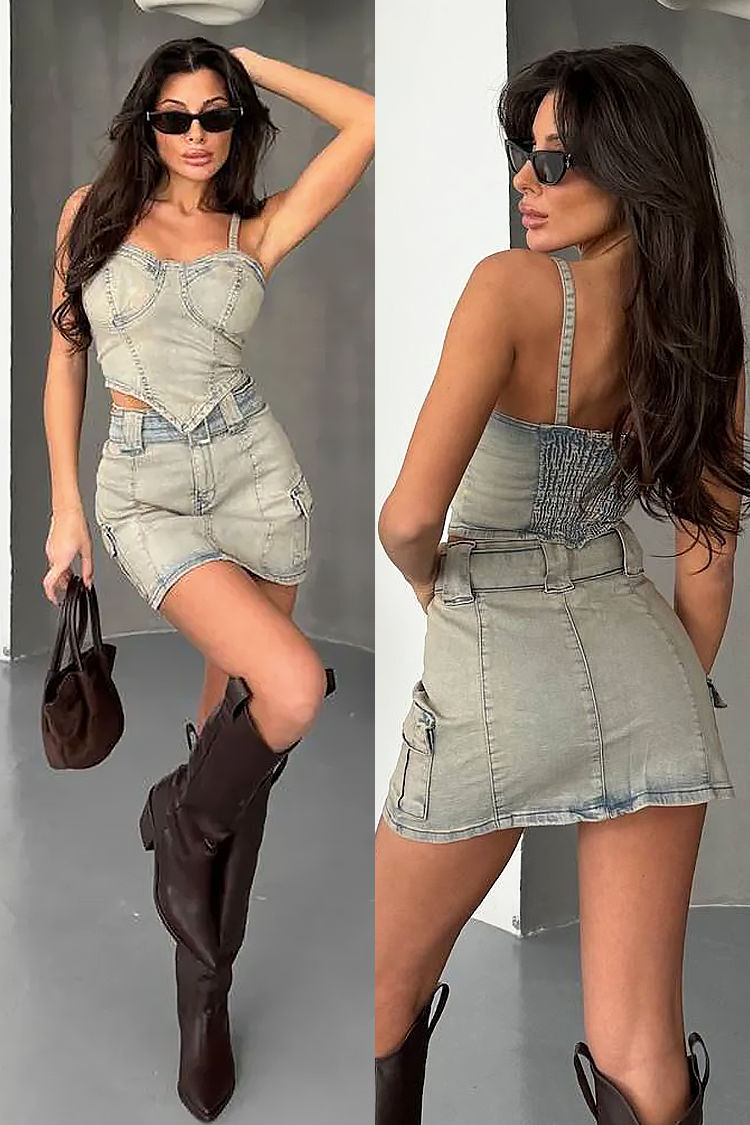 - Τζιν σετ δύο τεμαχίων: τοπ και κοντή φούστα, κατάλληλο για καθημερινές μοντέρνες εμφανίσεις.