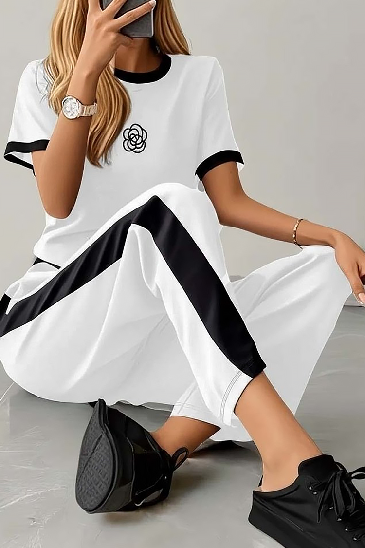 - Καθημερινό σετ από δύο κομμάτια, που αποτελείται από κοντομάνικη μπλούζα και παντελόνι σε ΤΡΕΝΔΥ χρώμα.