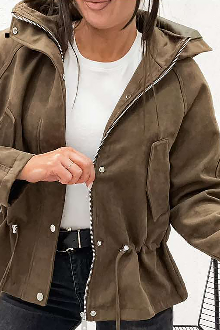 - Το μοντέλο έχει κουκούλα, φερμουάρ σε όλο το μήκος μπροστά, κοντό μήκος, πλαϊνές τσέπες και κορδόνια στη μέση.