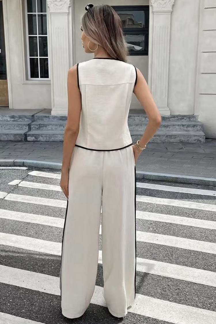 - Το πάνω μέρος είναι ένα κομψό γιλέκο με κουμπιά, ενώ το παντελόνι έχει ελεύθερο σχεδιασμό και ψηλή μέση.