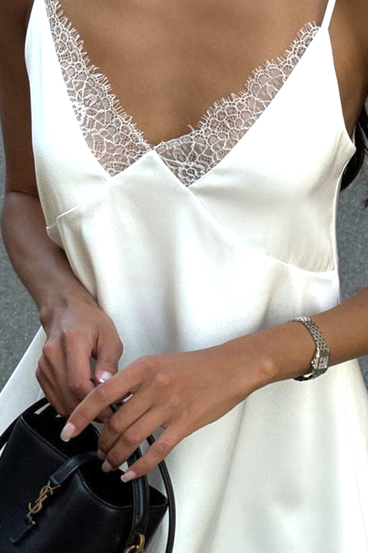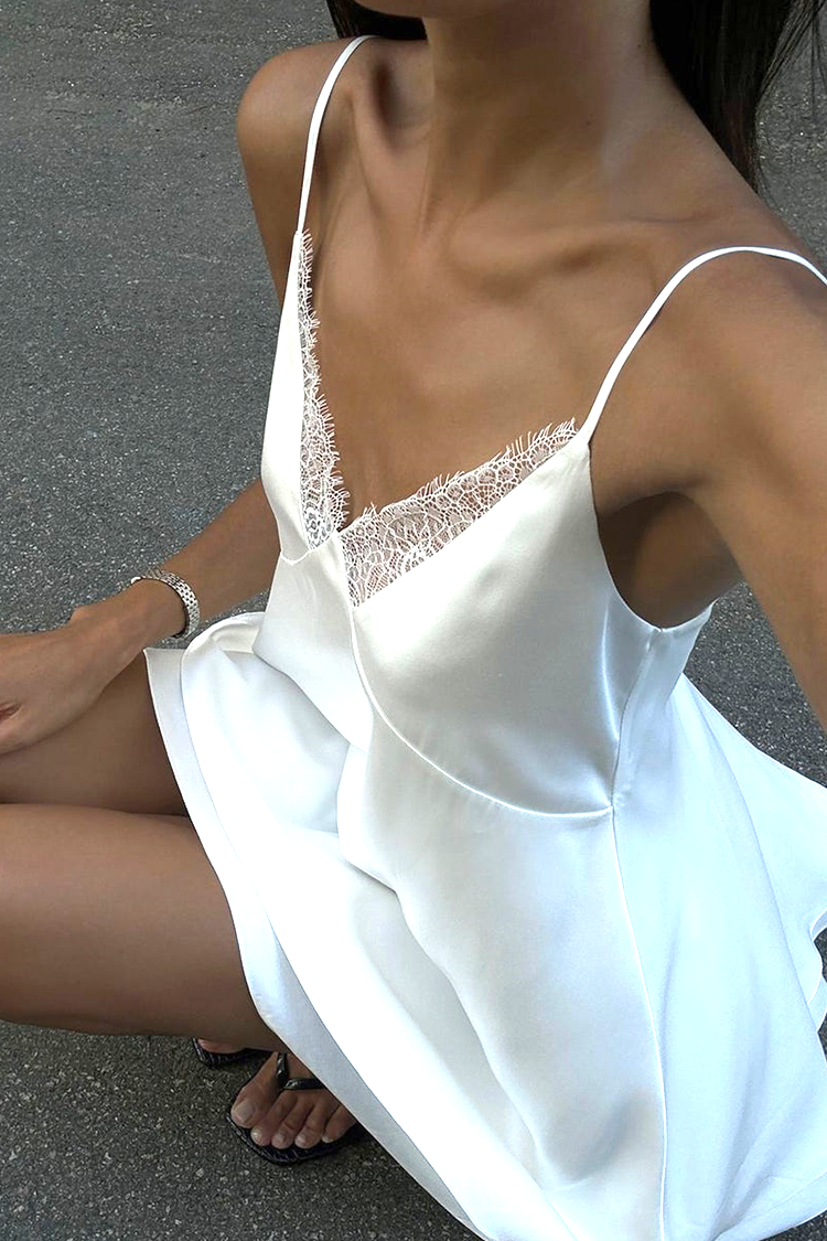 - Το φόρεμα έχει άνετη και ελεύθερη γραμμή, κοντό μήκος, εντυπωσιακή δαντέλα, λεπτές τιράντες και σέξι λαιμόκοψη.