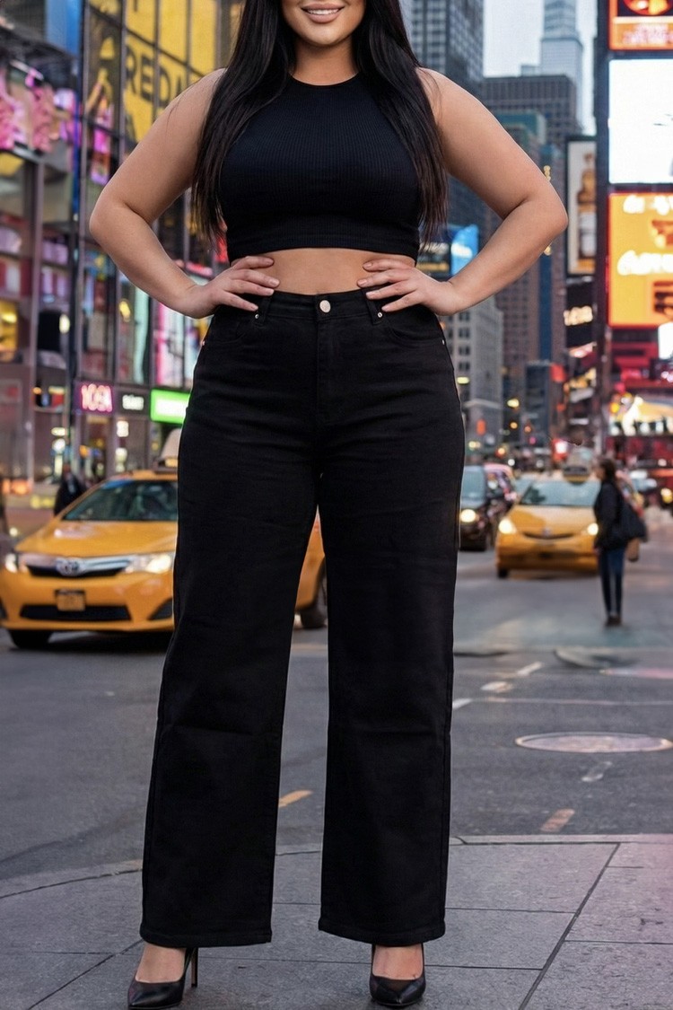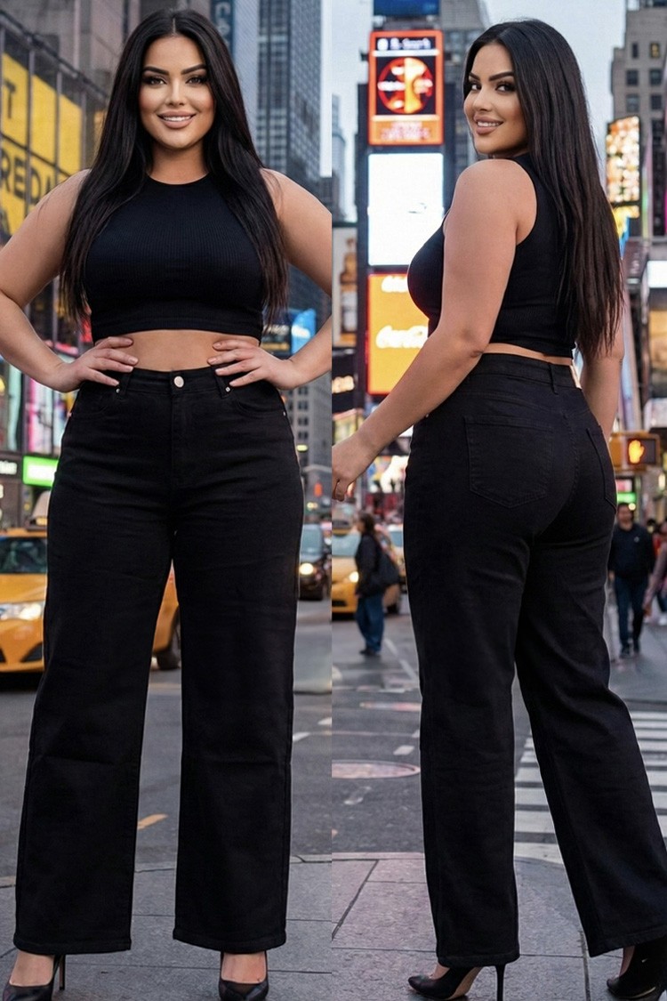 - Το μοντέλο έχει φαρδιά γραμμή, ψηλή μέση, τσέπες και μαύρο χρώμα.