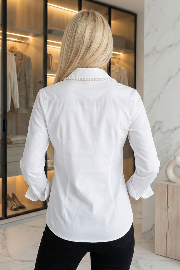 - Το μοντέλο έχει κλασικό σχεδιασμό, λευκό χρώμα, γιακά και γραβάτα με πέρλες.
