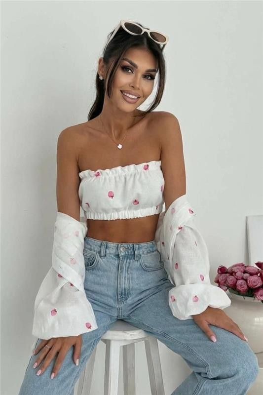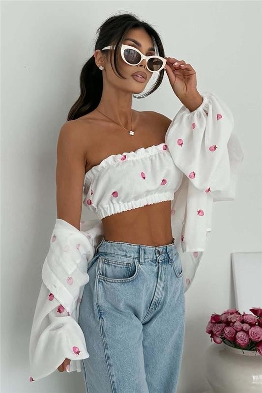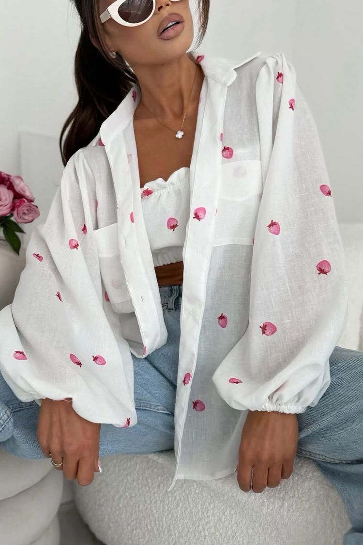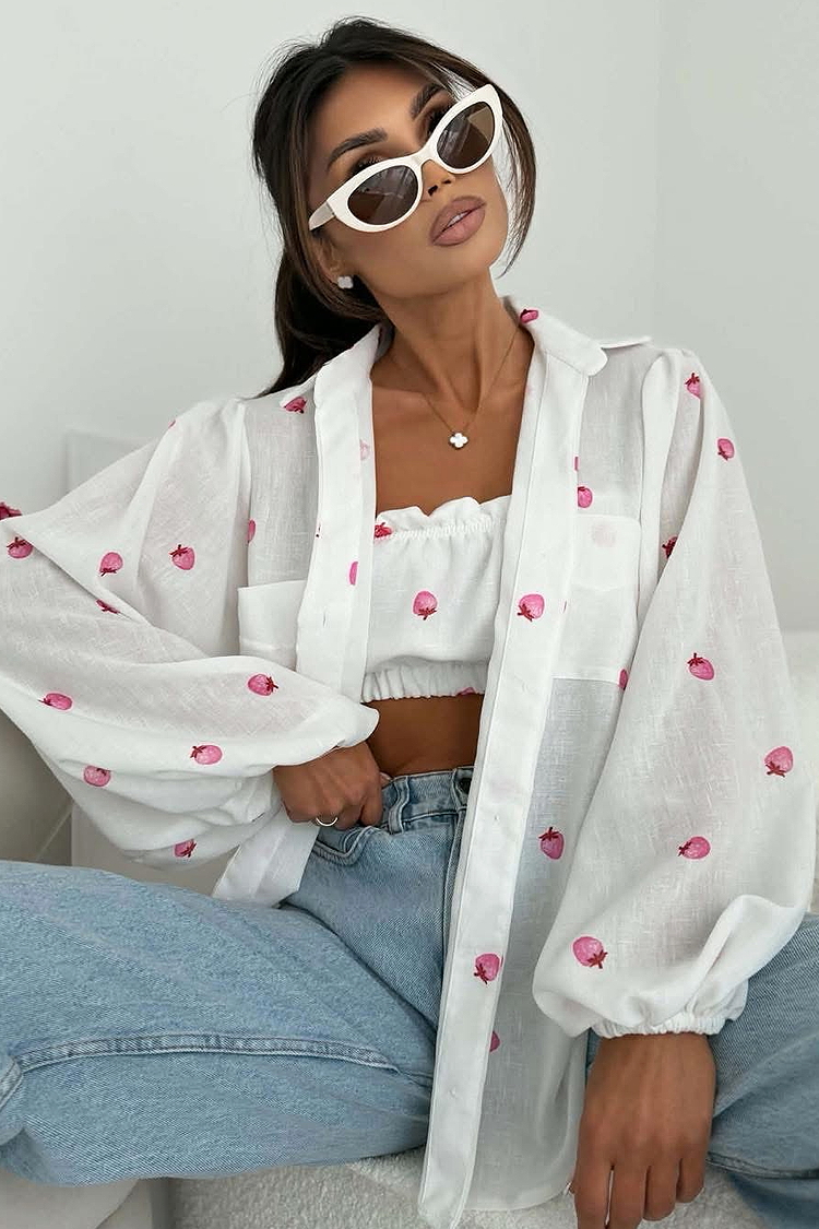 - Το πουκάμισο έχει μακριά μανίκια, κλασικό κλείσιμο με κουμπιά και μοτίβο με φράουλες, ενώ το τοπ είναι κοντό και έχει ανοιχτούς ώμους.