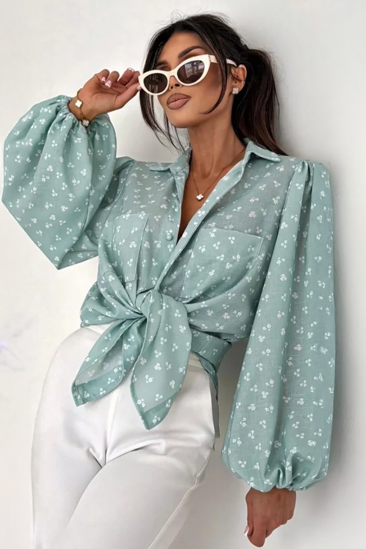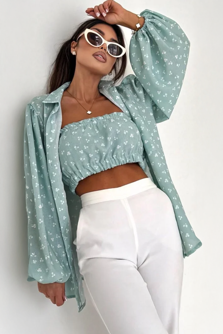 - Το πουκάμισο έχει μακριά μανίκια, κλασικό κλείσιμο με κουμπιά και εντυπωσιακό σχέδιο, ενώ το τοπ είναι κοντό και έχει ανοιχτούς ώμους.