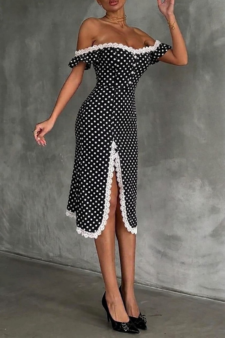 - Το μοντέλο έχει εφαρμοστή γραμμή, πεσμένους ώμους, σέξι σκίσιμο και πουά μοτίβο.
