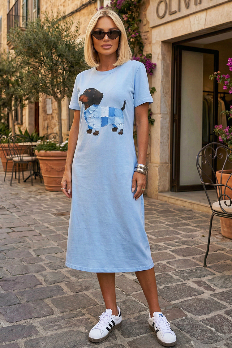 - Επιλέξτε αυτό το midi φόρεμα με εντυπωσιακό σχέδιο με ντάκελ σε γαλάζιο χρώμα – ιδανικό για καθημερινές και μοντέρνες εμφανίσεις.