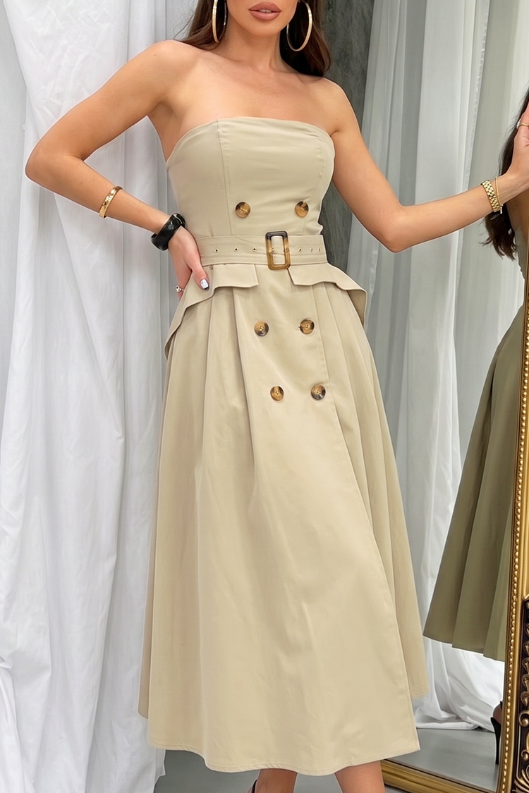 κομψό μακρύ ασύμμετρο φόρεμα με εφέ κορσέ FLORENTIA BEIGE